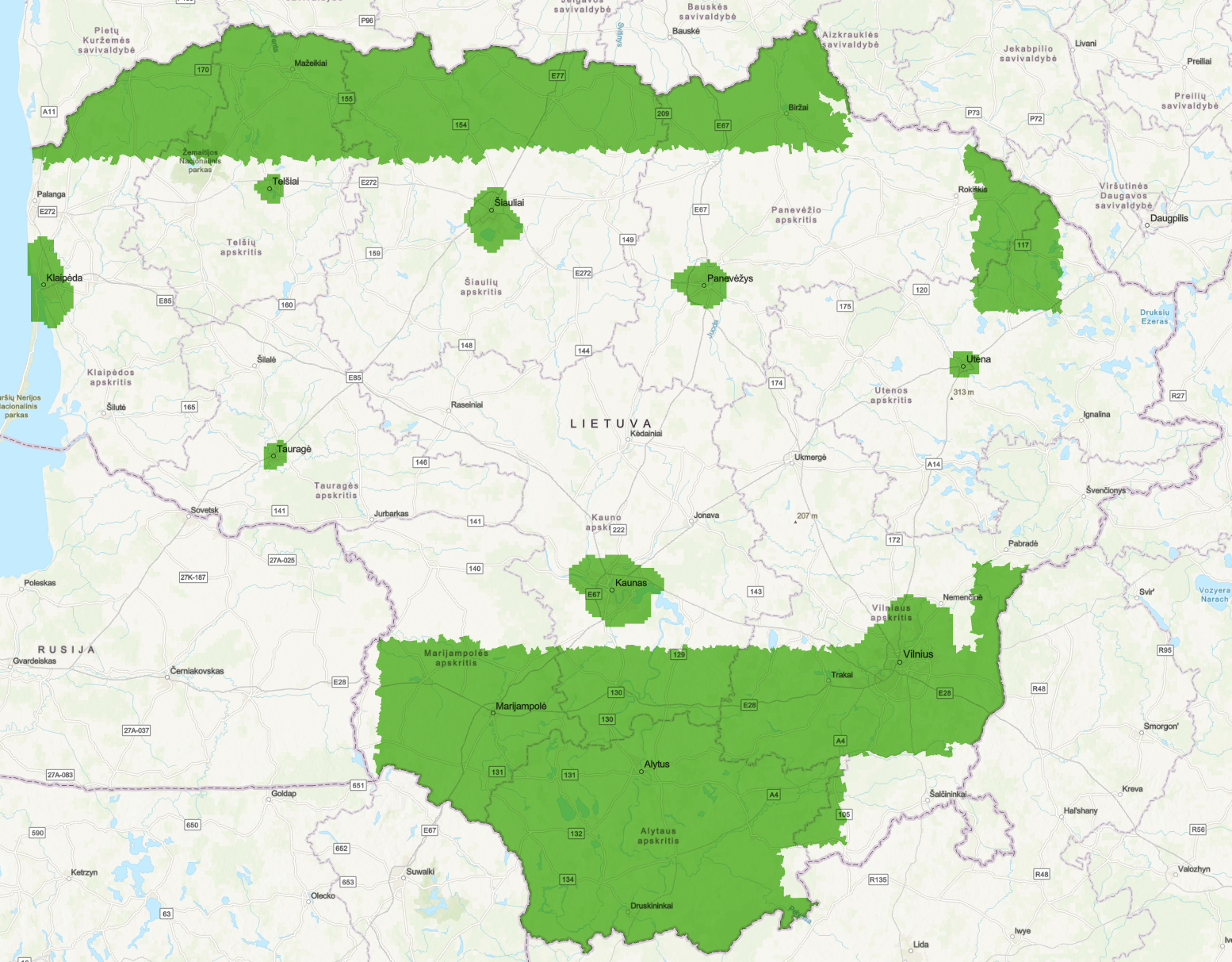 Lietuvos žemėlapyje pateikiami LOD1 detalumo lygio pastatai šiose teritorijose: